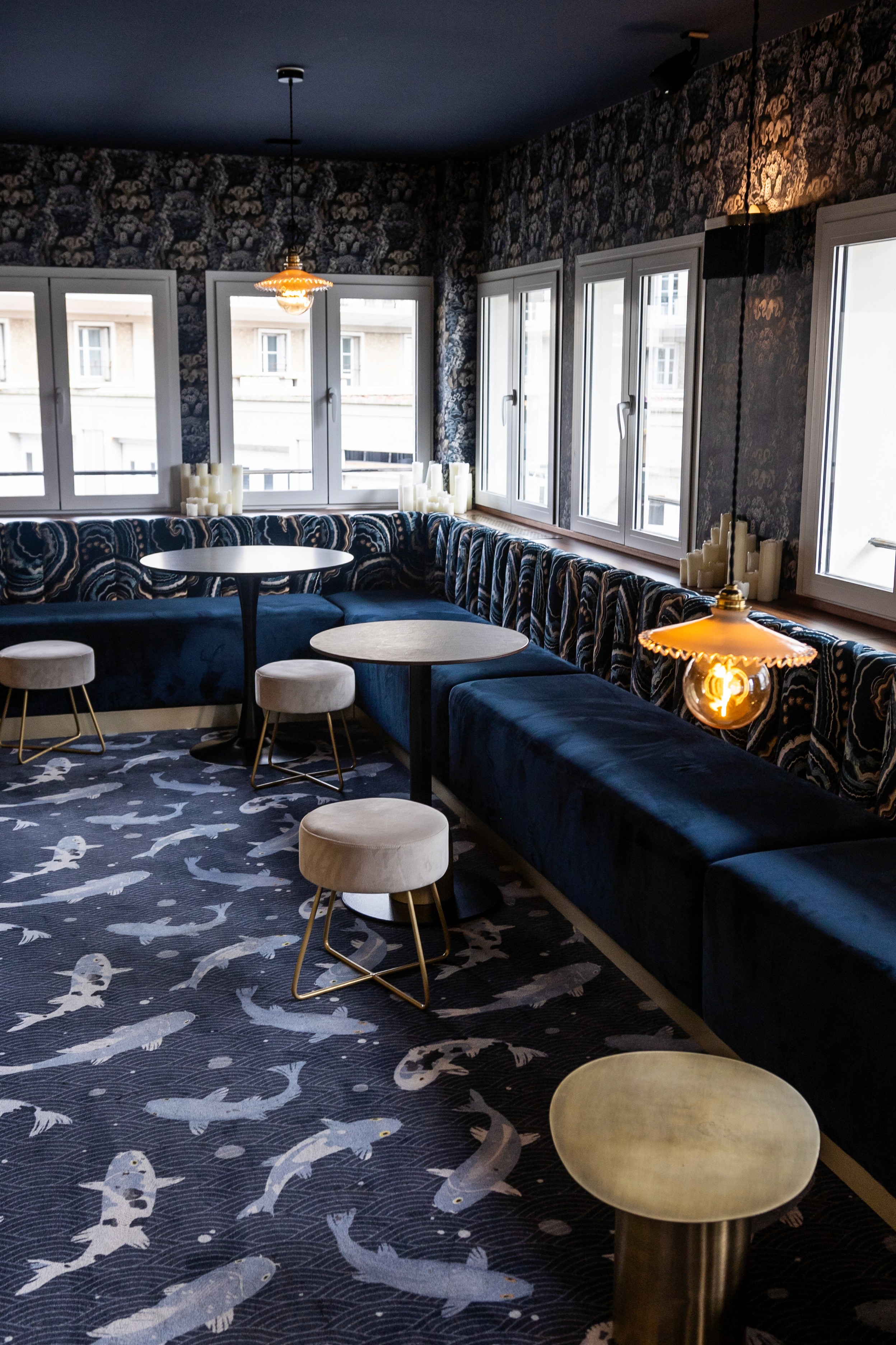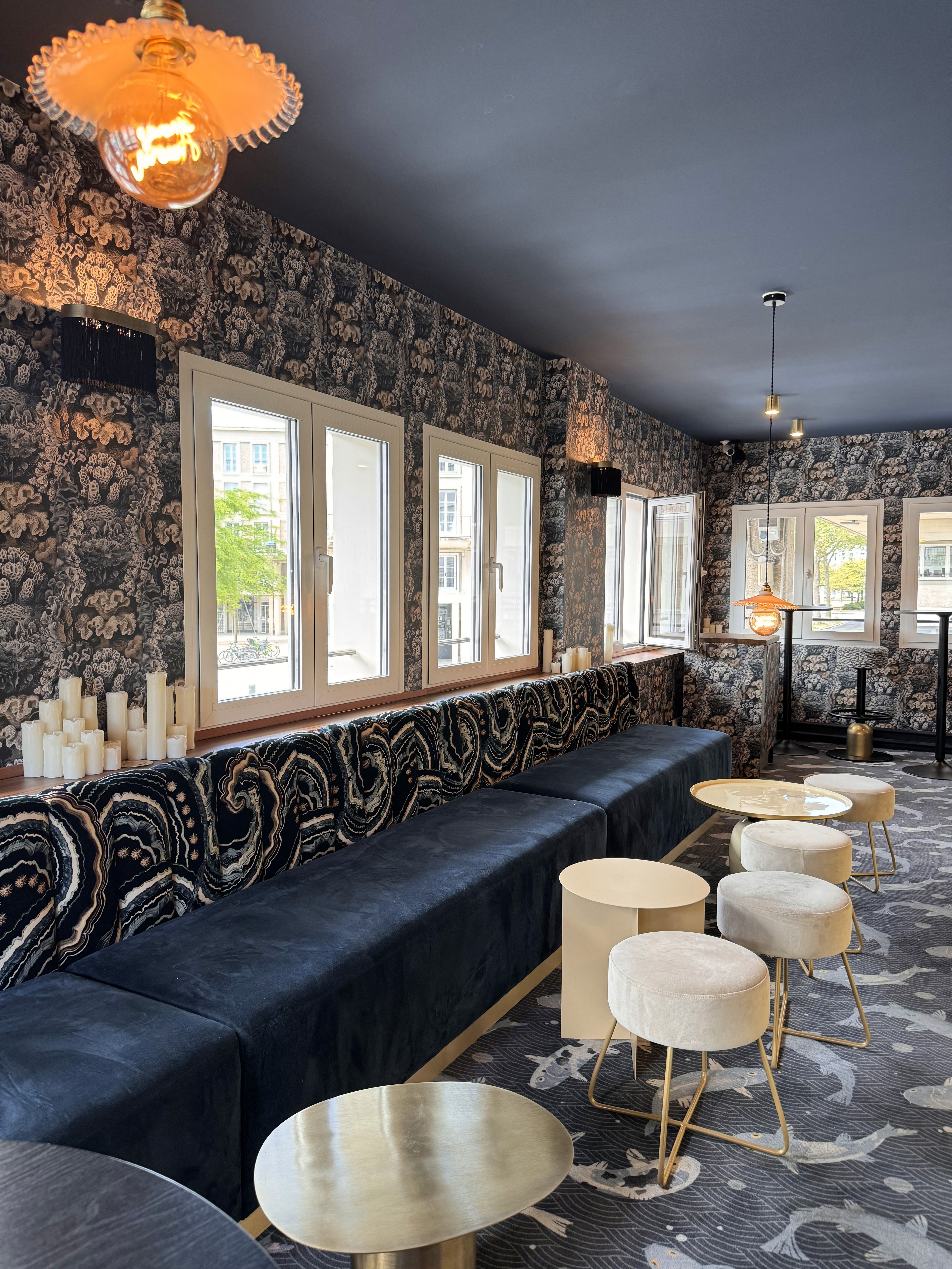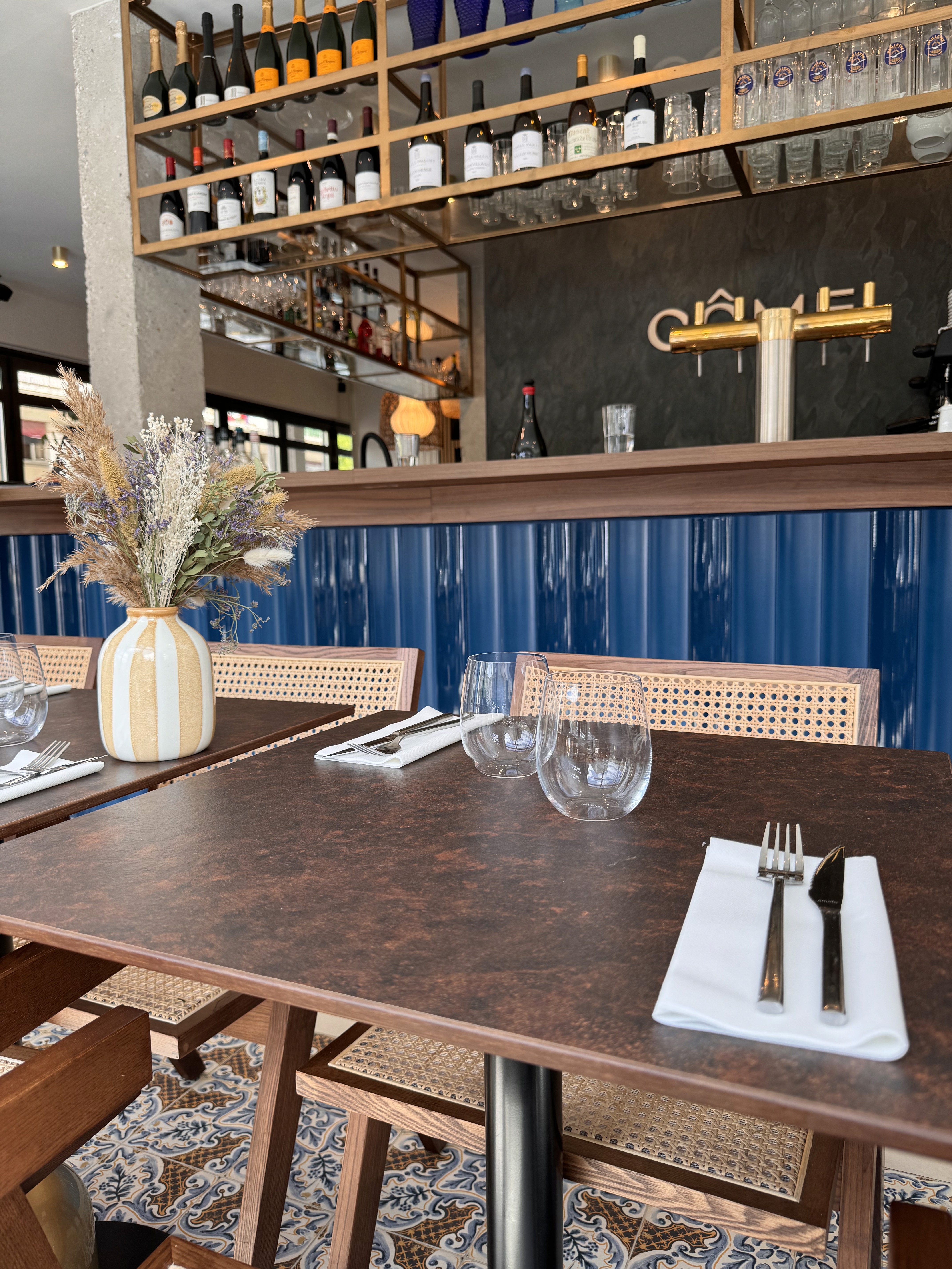 L’espace s’articule autour de deux ambiances distinctes : un restaurant ouvert et lumineux, et un bar à cocktails feutré, à l’atmosphère rétro-moderne.