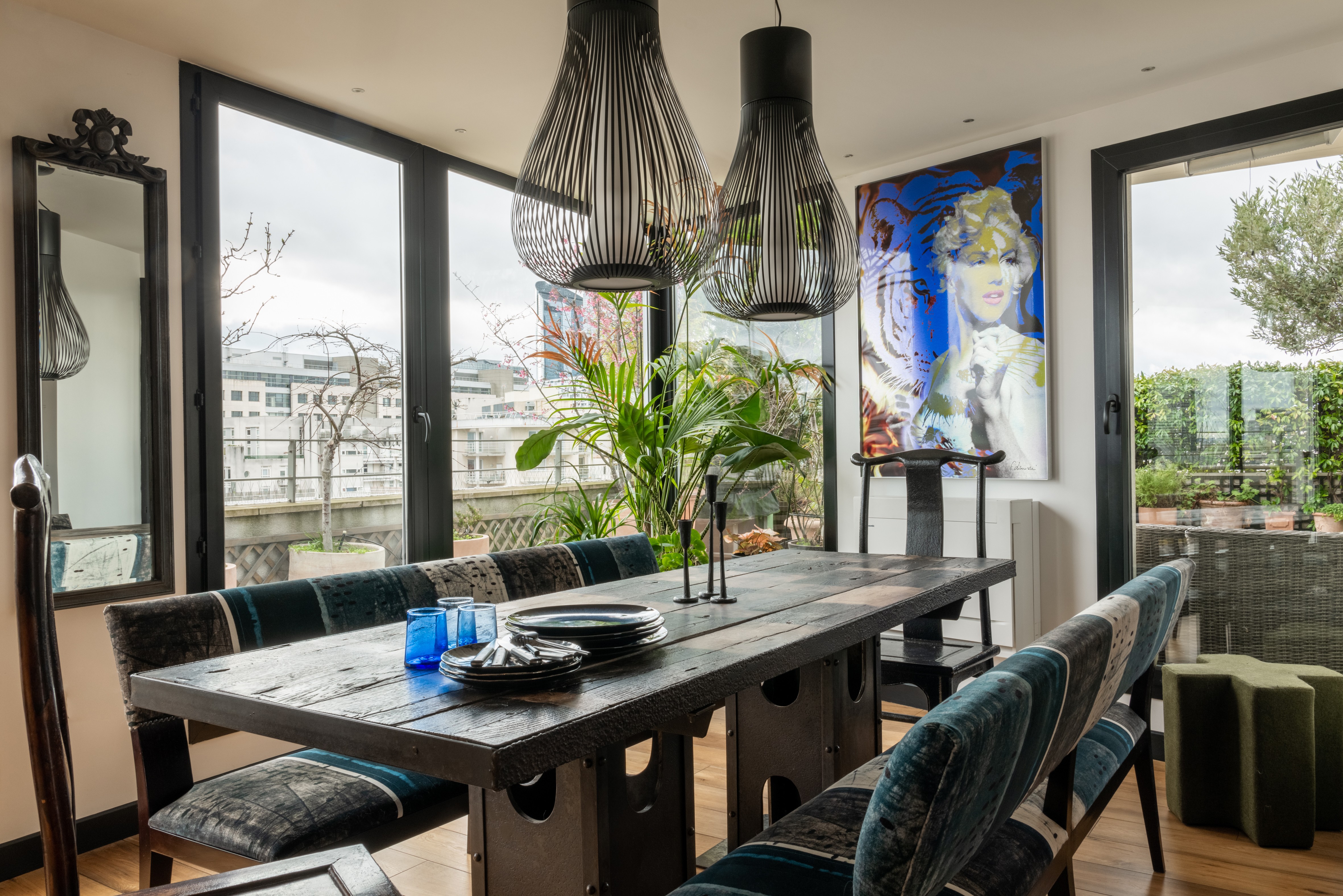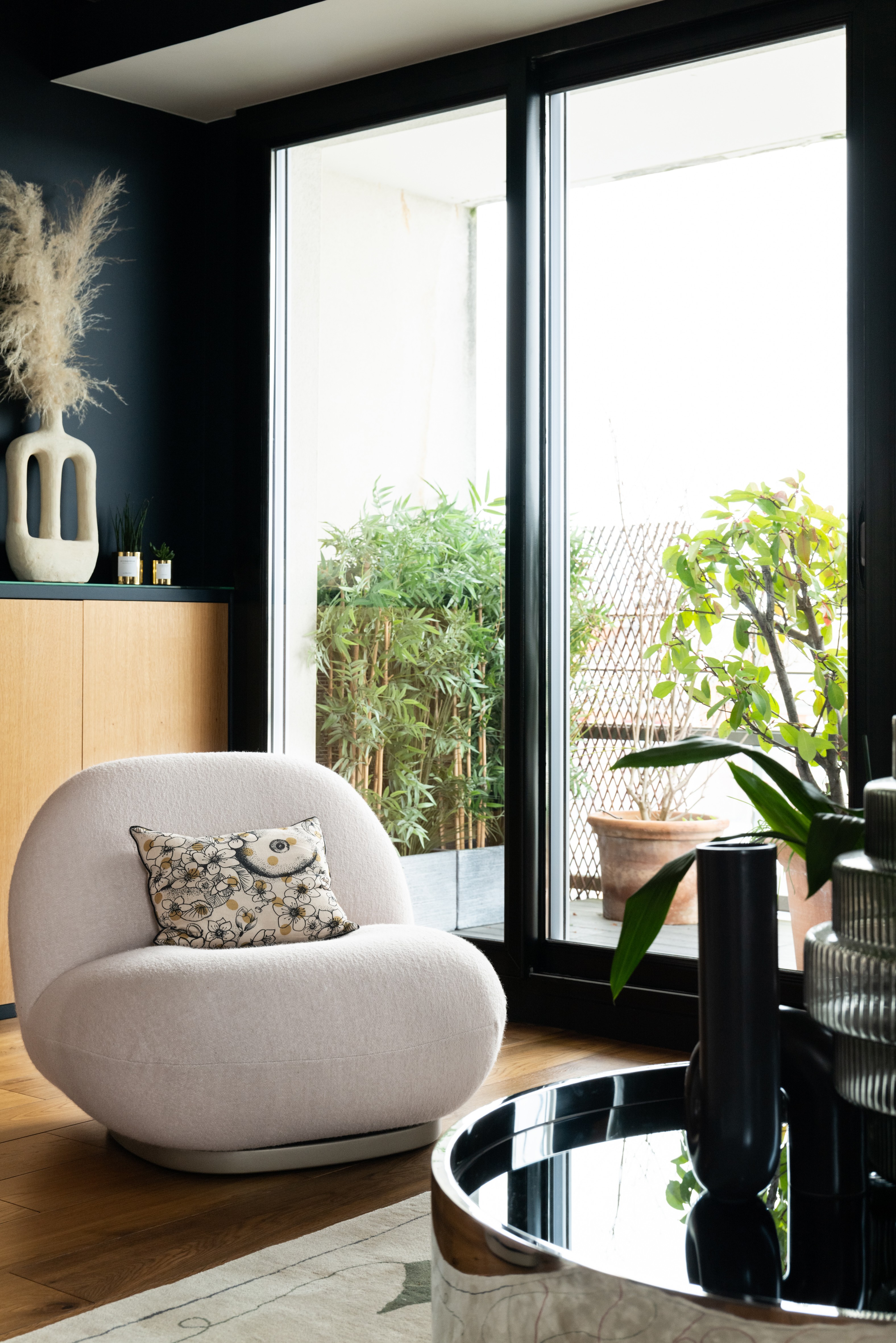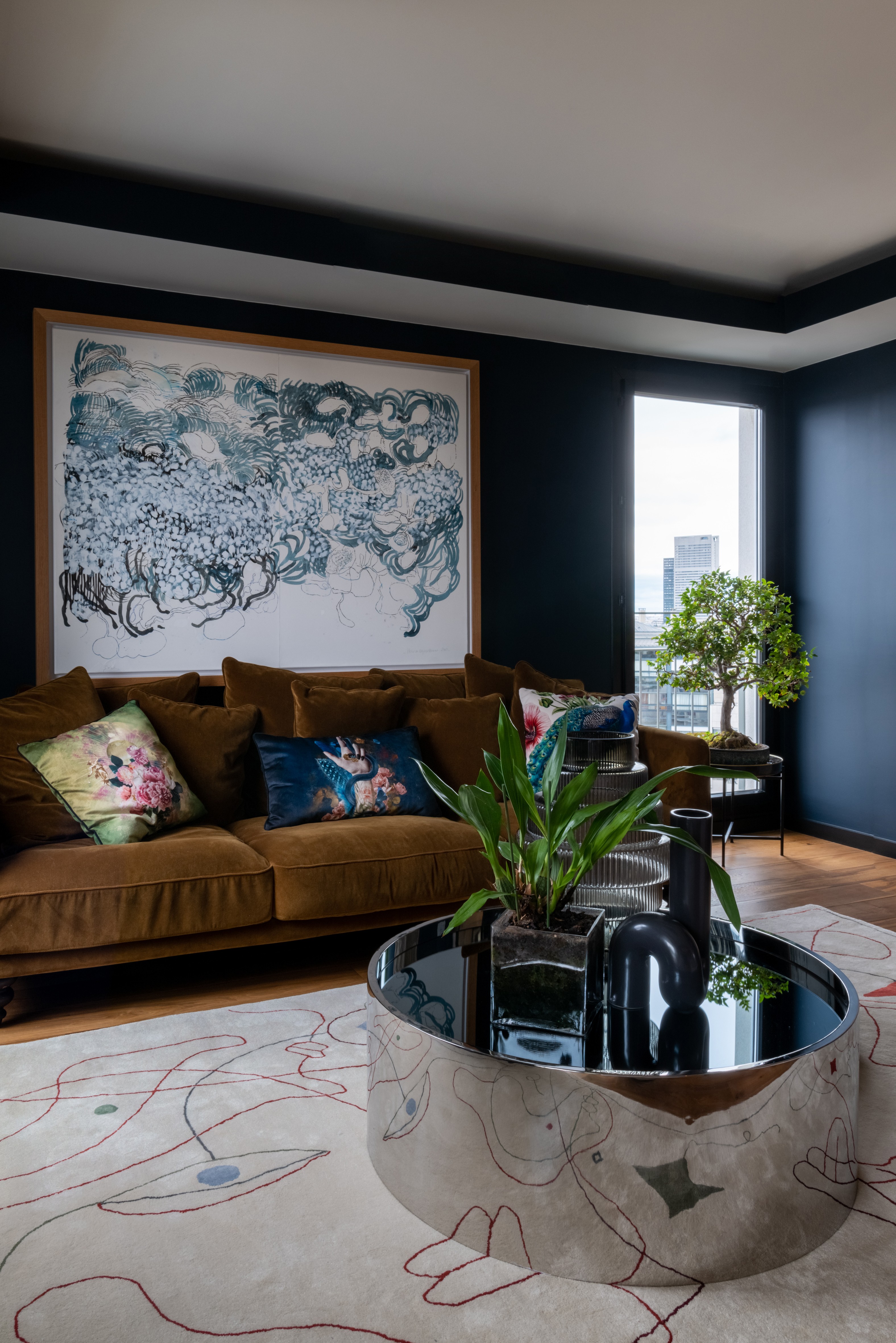 La réalisation pour ce grand duplex familial s’est orientée vers des marqueurs déco forts: prints, couleurs, matières en profitant de la luminosité exceptionnelle de l’appartement. Les propriétaires souhaitaient créer un espace convivial, accueillant et design sans compromis sur la circulation, la lumière et le confort. Chaque pièce de l’appartement a été travaillée avec une ambiance couleur/matières identitaire. L’objectif était de valoriser les volumes de l’appartement mais également des pièces fortes de mobilier déjà présentes dans l’appartement.