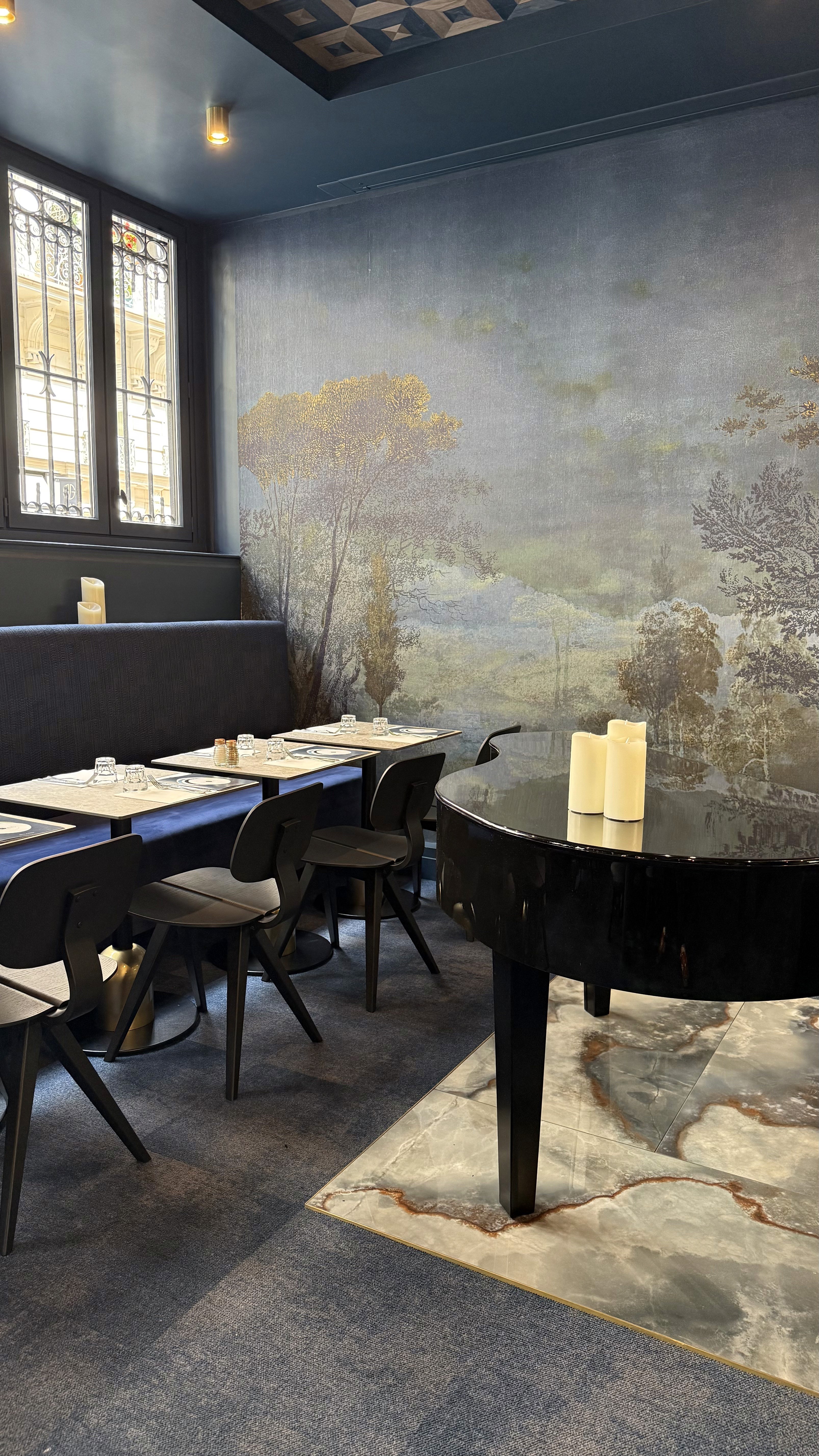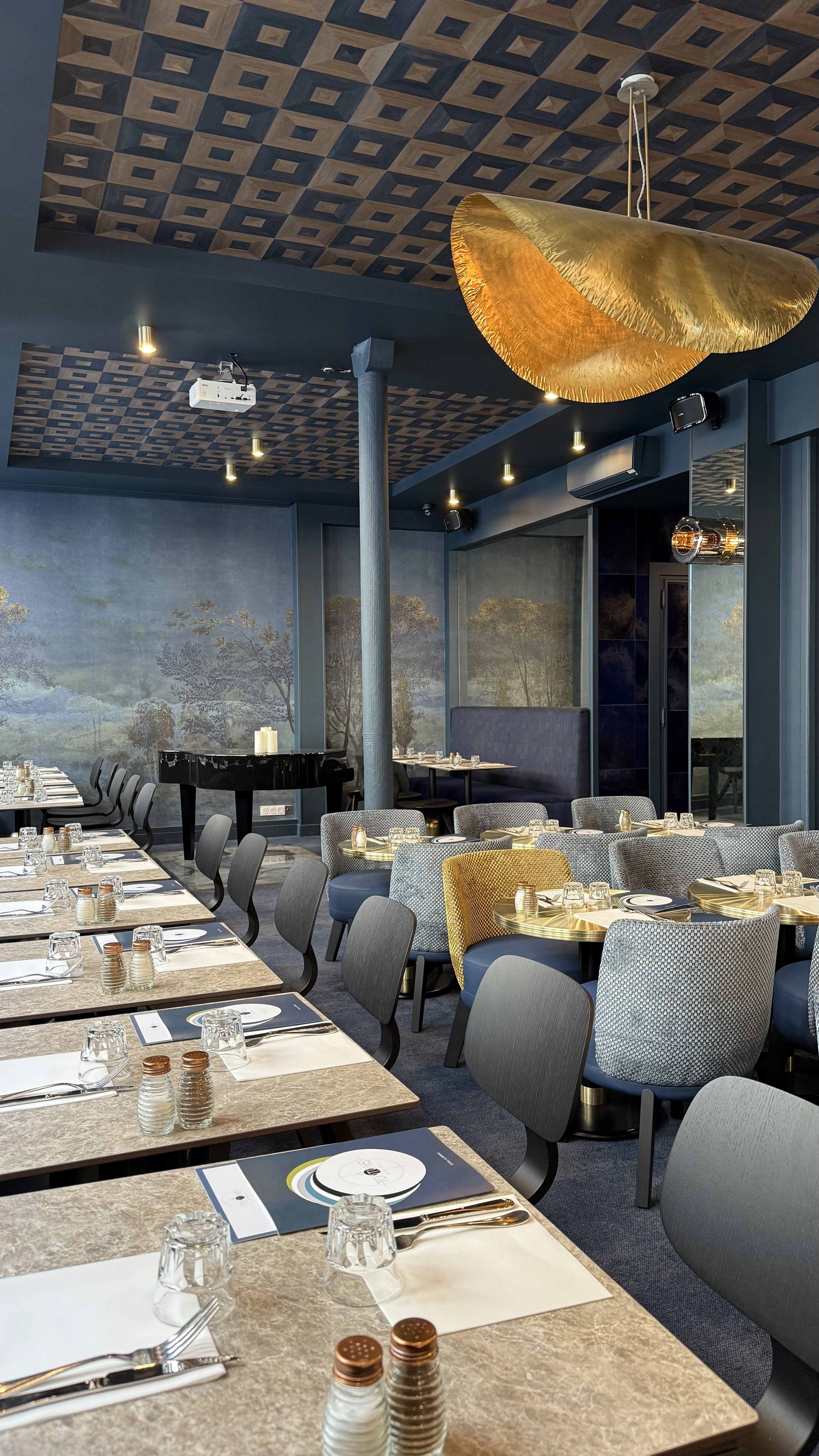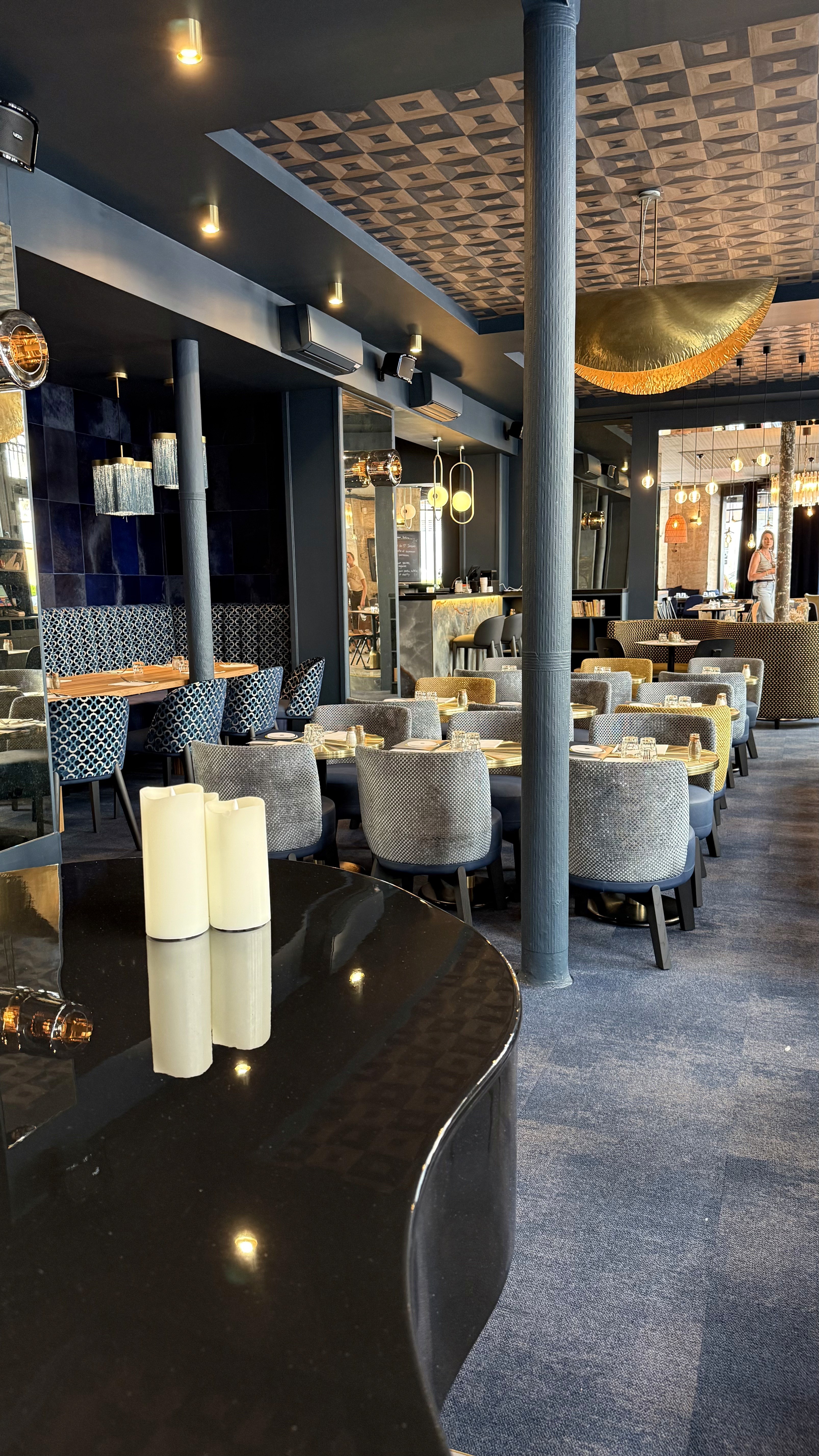 Ce qui change? Presque tout: peinture murale, moquette au sol, plafond habillé, nouvelles assises, tables et nouveaux luminaires mais on a gardé certains marqueurs comme le bleu couleur fil rouge du projet les tontons, le laiton, le mix matières, le bar mis en scène, le travail de lumières en suspensions…