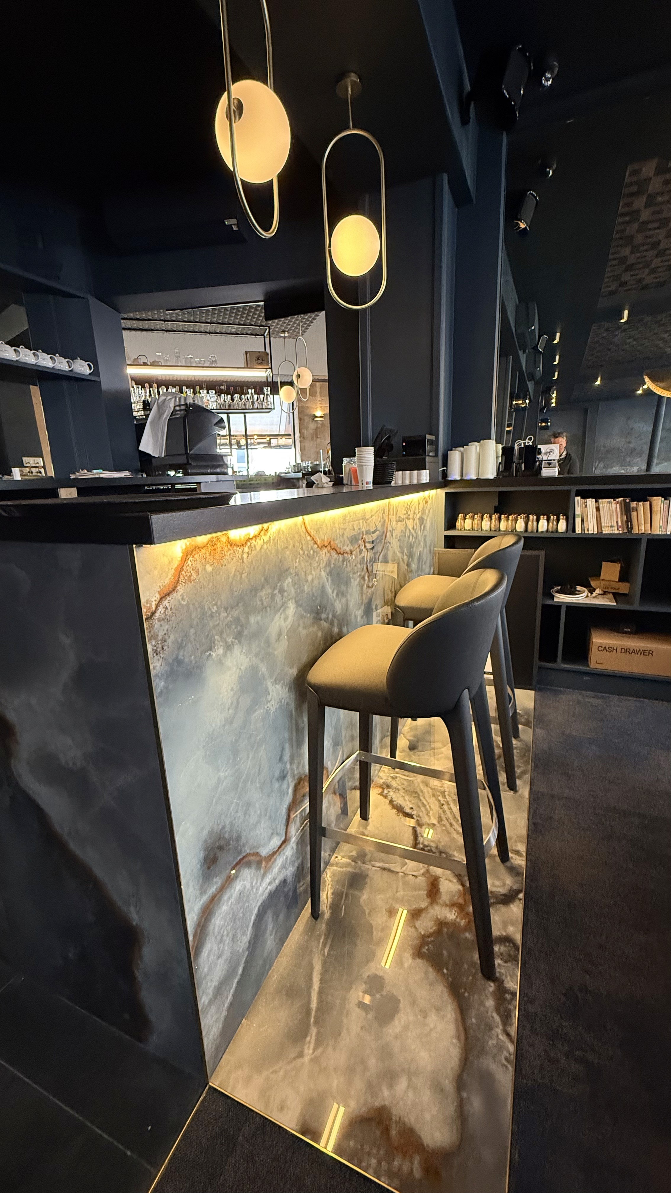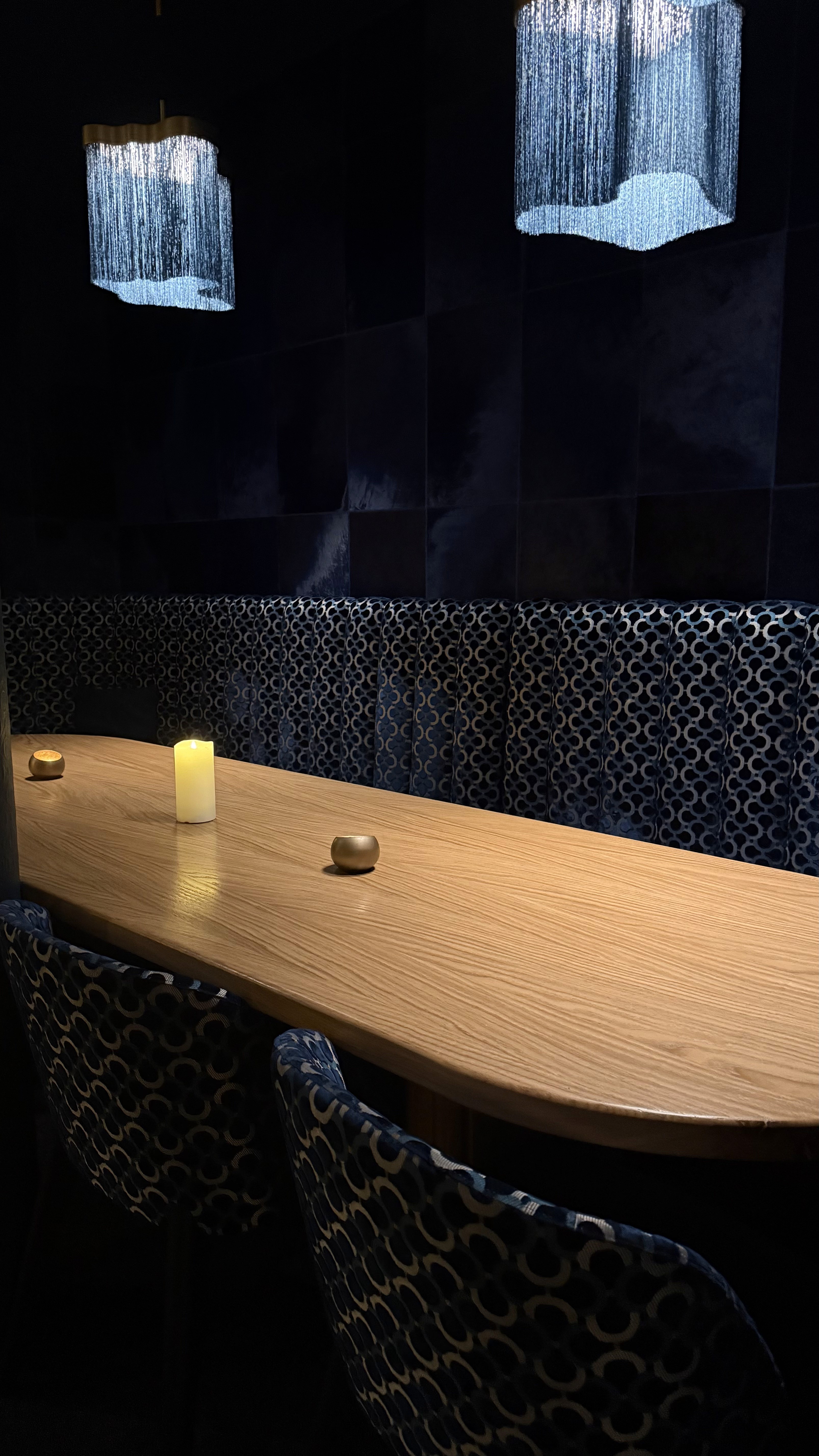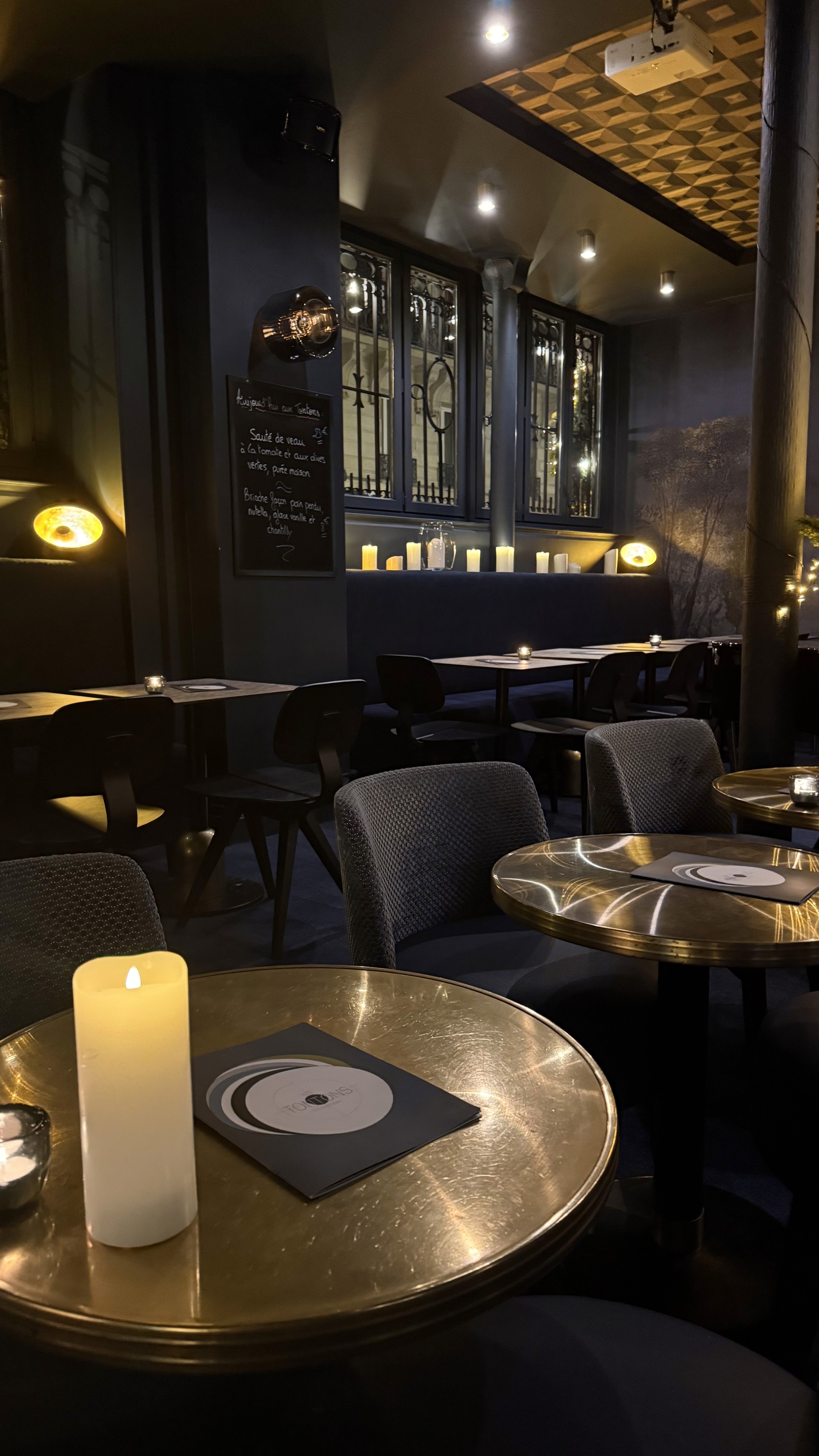 Ce qui change? Presque tout: peinture murale, moquette au sol, plafond habillé, nouvelles assises, tables et nouveaux luminaires mais on a gardé certains marqueurs comme le bleu couleur fil rouge du projet les tontons, le laiton, le mix matières, le bar mis en scène, le travail de lumières en suspensions…