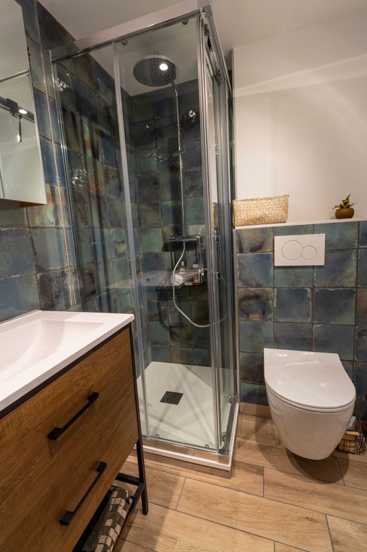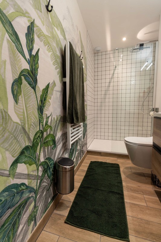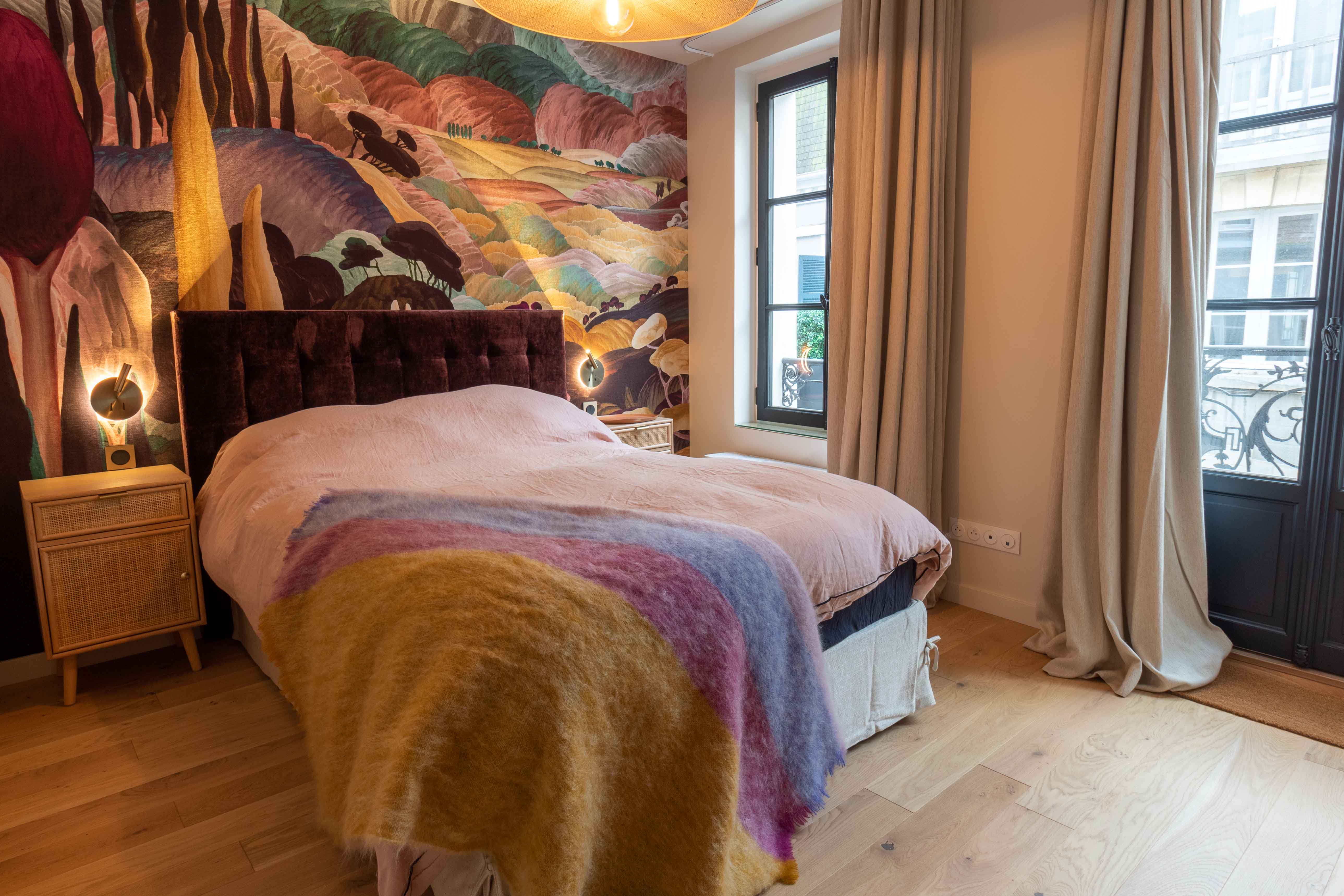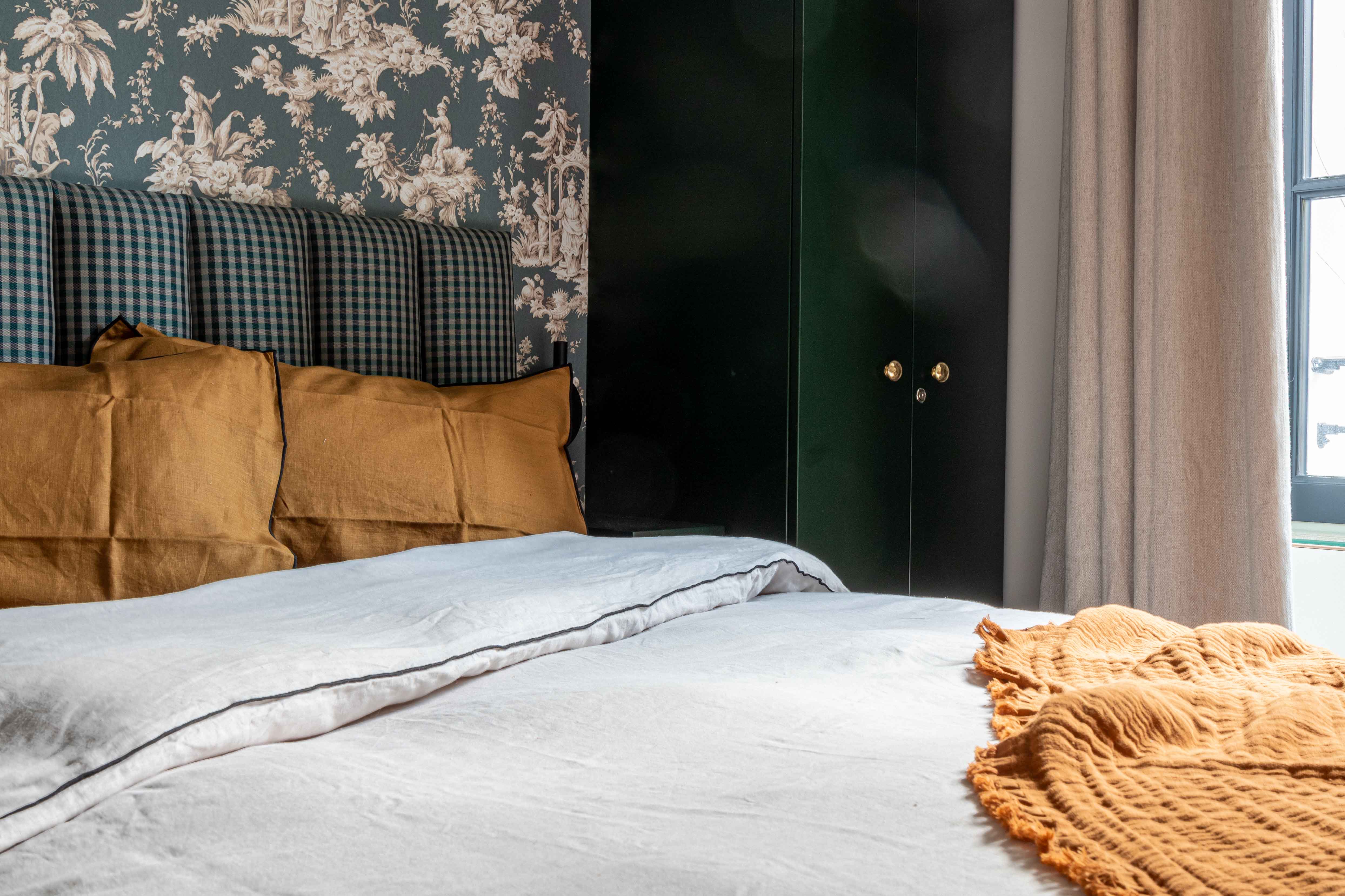 Pour l’appartement deux pièces, la base d’inspiration a été les codes de la Normandie revisités. Un appartement chic et de charme répondant aux codes de l’hébergement 4* mais qui conserve une atmosphère accueillante, chaleureuse et intime. Pour traduire les codes de la Normandie, nous avons positionné des soubassements contrastés dans le salon associés à un papier peint type fontainebleau. La chambre à coucher a été travaillée avec une association subtile entre la toile de joui, le tartan et les moulures.