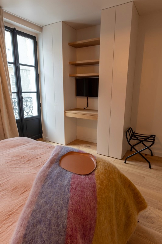 Pour l’appartement 3 pièces, nous avons opté pour une atmosphère trés marquée dans les chambres et une ambiance plus douce et feutrée dans le salon. Le mobilier des chambres a été réalisé en sur mesure pour renforcer le coté pretium du logement.